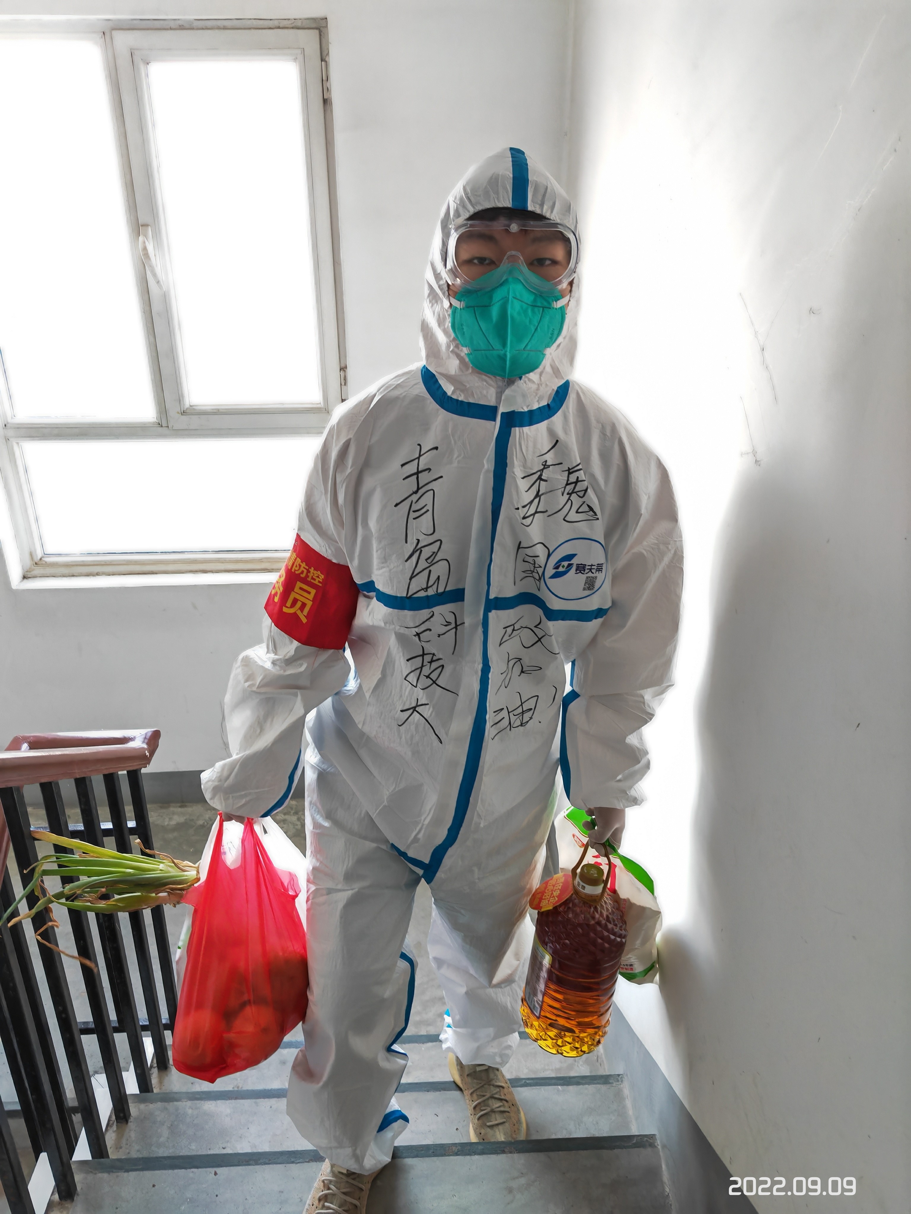 下图为魏国政同学给社区被隔离在家的居民运送生活物资时的场景。