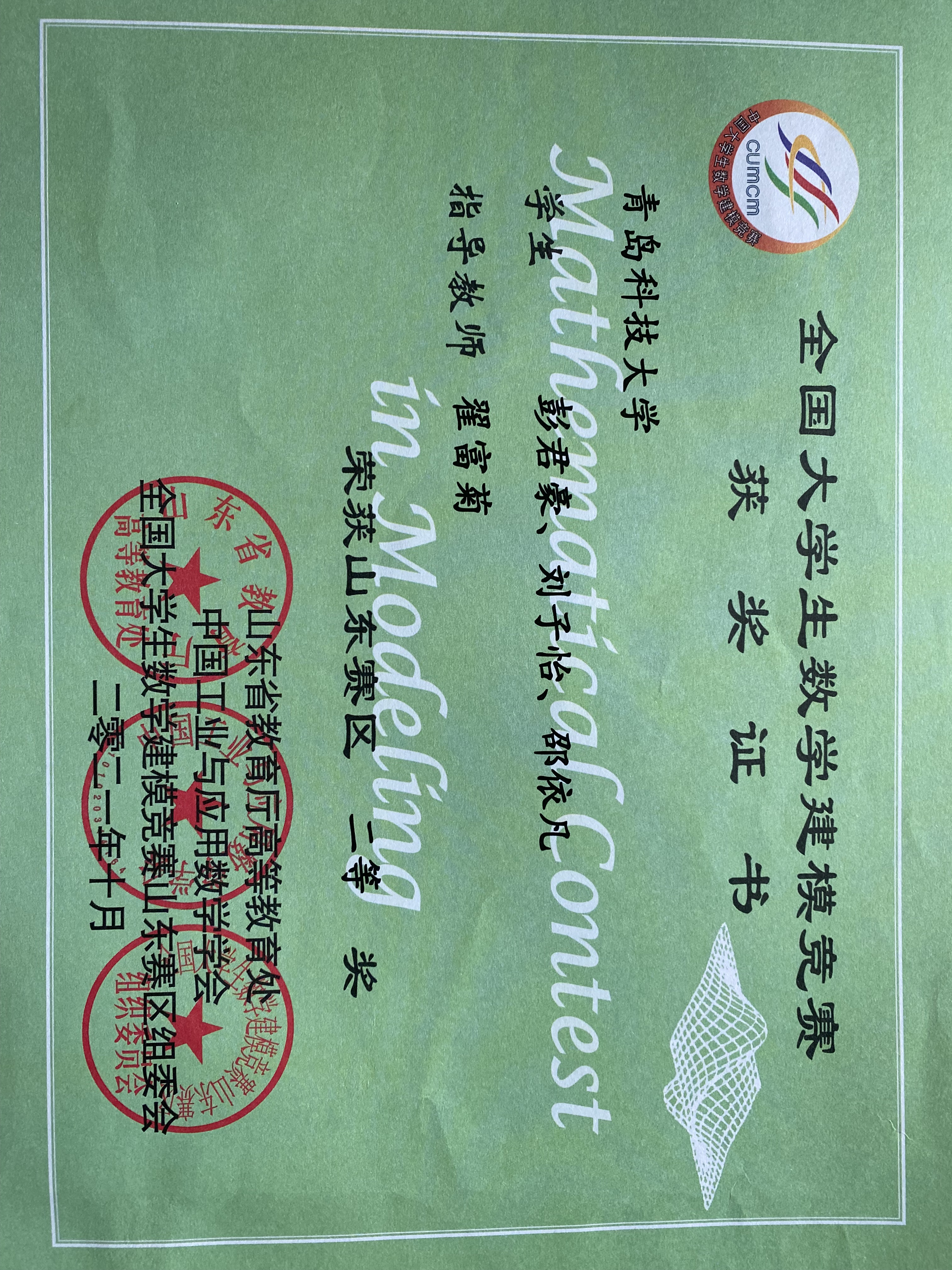 全国大学生数学建模竞赛山东省二等奖;