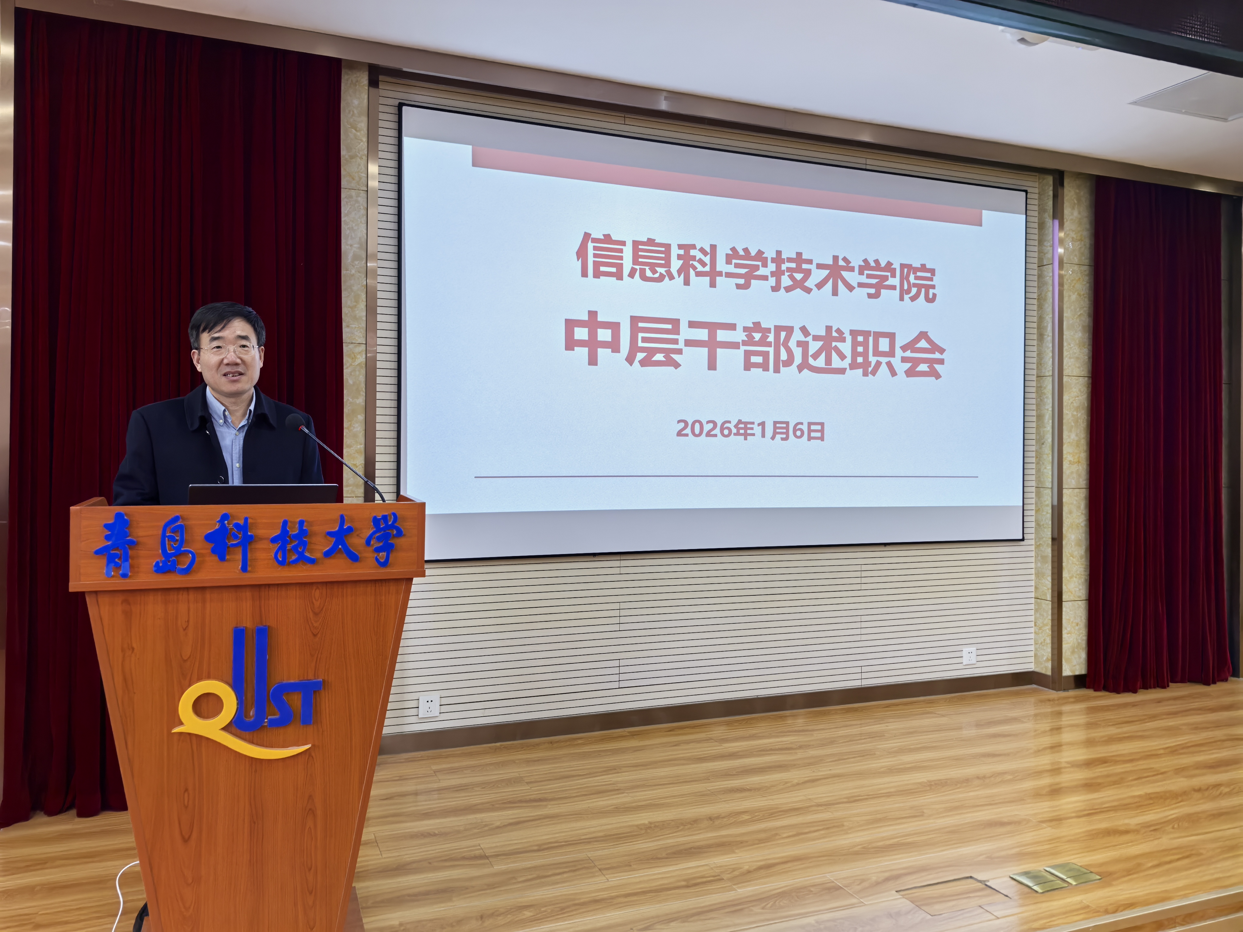 在学院402报告厅召开中层干部年度述职会,学院领导班子成员及全体教职工参加此次会议。会议由学院党委书记许桂锋主持。